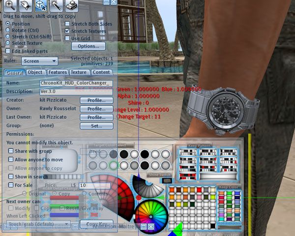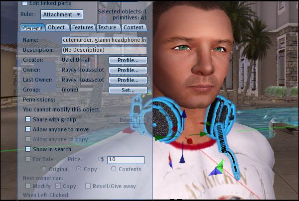You know how textures flash when you have overlapping prims? In this case, I think it's a case of overlapping prims, with slightly offset textures, that create a dazzling, sparkling effect like diamonds under light. Despite the fact that Cutemurder officially makes women's stuff, I think the sparkly glam headphones look great for either sex, and are a must see for anyone who loves creating sparkly things.