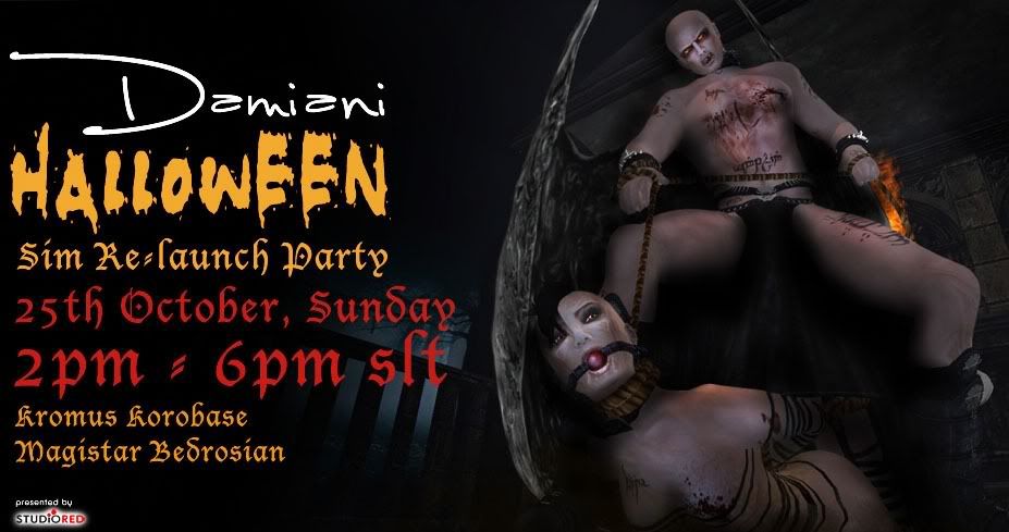 Tomorrow is just as exciting, only this one has a twist of Halloween thrown in. Damiani are having a Halloween Party to launch their new sim. I am a good friend of Pompeja, owner of Damiani so I can assure you that you will get a good laugh at this party. The party has been organised by the Studio Red Team who are Second Life’s Event experts, so you won’t want to miss this.